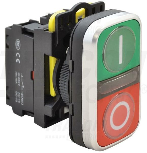 TRACON Kettős BE-KI nyomógomb, I-O, zöld+piros (NYG3-D1) Műszak i adatok: 1×NO+1×NC 5A/230V AC-15 IP65