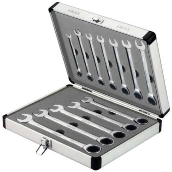 12 részes profi készlet. Tartalma: 8, 9, 10, 11, 12, 13, 14, 15, 16, 17, 18, 19 mm-es kulcsok. CrV acél, matt krómozással, racsni 72 foggal, finom fogazású. Súly: 2,35 kg.
