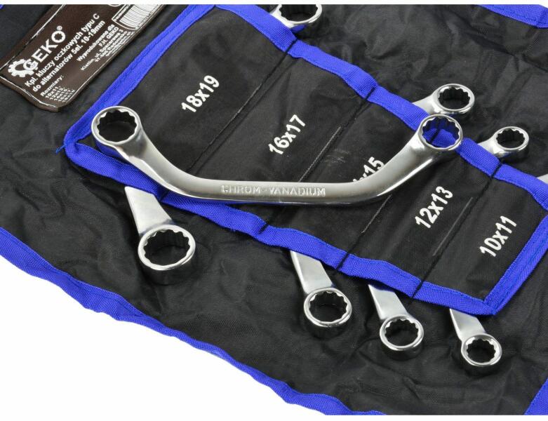 A termék leírása: 5db félhold gyűrűs csavarkulcs készlet 10 - 19mm. Az ilyen típusú villáskulcsokat olyan helyeken használják, ahol az akadályok akadályozzák a hozzáférést egyenes villáskulcsokkal. A termék jellemzői: A készlet 5 részes félhold csavarkulcsot tartalmaz: 10x11mm, 12x13mm, 14x15mm, 16x17mm, 18x19mm Króm-vanádium acél kovácsolás a tartósságért Polírozo