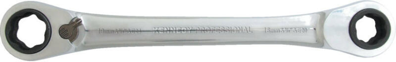 Kétvégű racsnis csavarkulcs, négyféle csavarmérethez. A 72 fogú racsnis kart elegendő csupán 5° -kal elforgatni használat közben, így ideális szűk helyeken történő használathoz. A kulcs kiváló minőségű króm-vanádium acélötvözetből készül, tükörfényű felülettel, mely meggátolja az olaj és kosz rátapadását a kulcsra. Méret tartomány: 9 - 15 mm Teljes hossz
