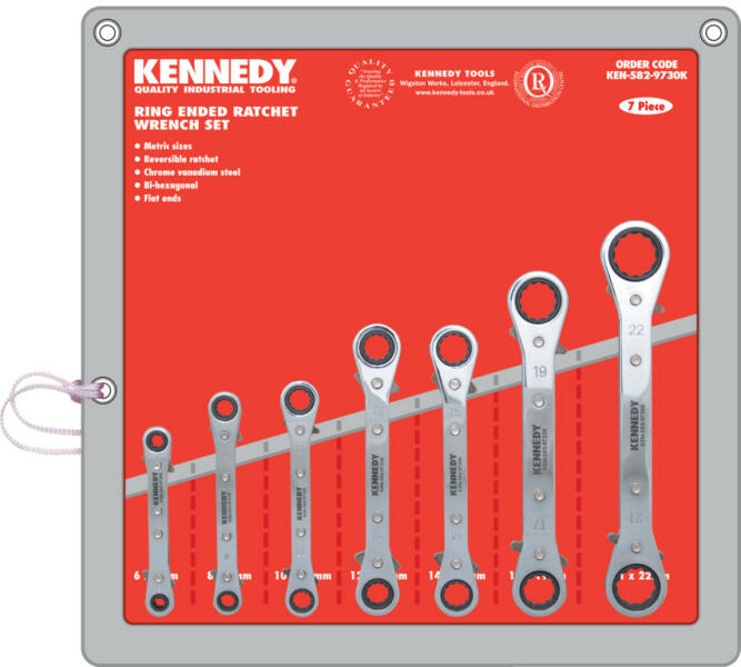 Króm-vanádium acélból gyártott kulcsok, 12-szögű fejekkel. Szűk helyekre tervezve. Mindkét oldalon beépített racsnival a nagyobb termelékenység érdekében. A racsnik forgásiránya a kulcs oldalán található irányváltókkal változtatható. Készletek összetétele: 6 x 7, 8 x 9, 10 x 11,12 x 13, 14 x 15, 17 x 19 és 21 x 22 mm-es kulcsok.