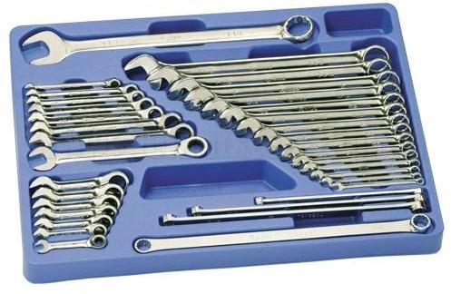 35 darabos csillag-villáskulcs készlet szerszámos kocsik kihúzható fiókjához kialakítva. Kiváló minőségű teljes fiókbetét, melynek segítségével praktikusan és rendezetten tarthatja szerszámait. Mindegyik kulcs tükörfényes polírozású. A csillag-villás kulcsok villás vége horizontálisan, csillag vége vertikálisan 15°-kal hajlított. A csillagkulcsok egyenesek. A racs