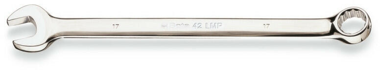 Beta - Italy Hosszított csillag-villás kulcs chrómozott fényes felülettel. Tulajdonságok: - Anyaga: Chrome-Vanádium acél - Felület: Fényesre polírozott - Méret: 10 mm - Csillag és villásfej profil 15°-ban döntött - Kivitel: Csillag-villás Méretek: Hosszúság: 172 mm Villásfej szélessége:22,1 mm Csillagfej átmérője: 16,5 mm Villásfej magassága: 5,5 mm Csillagfej magassá