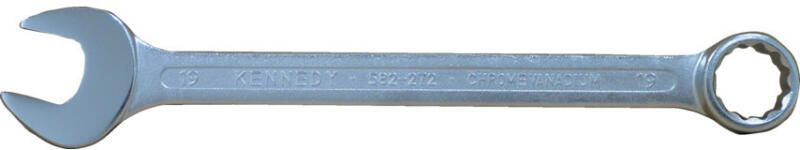 Selyemfény polírozású, króm-vanádium acélból készült kulcs, polírozott és 15°-ban hajlított fejekkel. Méret: 19 mm Teljes hossz: 230 mm Súly: 159 g