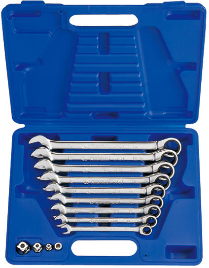 King Tony racsnis csillag-villáskulcs készlet 13db-os 8-19mm Racsnis csillag-villáskulcs polírozott króm felülettel. 5°-os szögosztásos racsnival, 72 fog. A King Tony racsnis csillag-villás kulcs króm-vanádium acélból készül, a racsni S2 anyagból van. A készletben lévő King Tony racsnis csillag-villás kulcsok és kiegészítők megvásárolhatók darabonként is. A készletben