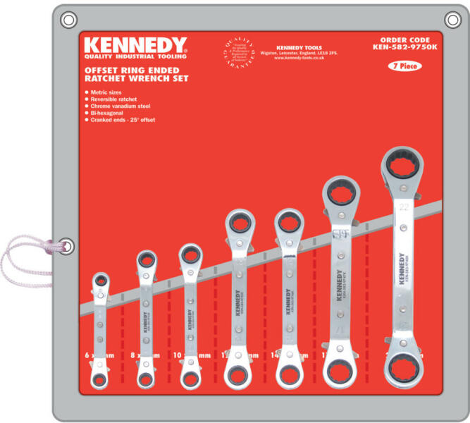 Króm-vanádium acélból gyártott kulcsok, 12-szögű fejekkel. Szűk helyekre tervezve. Mindkét oldalon beépített racsnival a nagyobb termelékenység érdekében. A racsnik forgásiránya a kulcs oldalán található irányváltókkal változtatható. Készletek összetétele: 6 x 7, 8 x 9, 10 x 11,12 x 13, 14 x 15, 17 x 19 és 21 x 22 mm-es kulcsok.