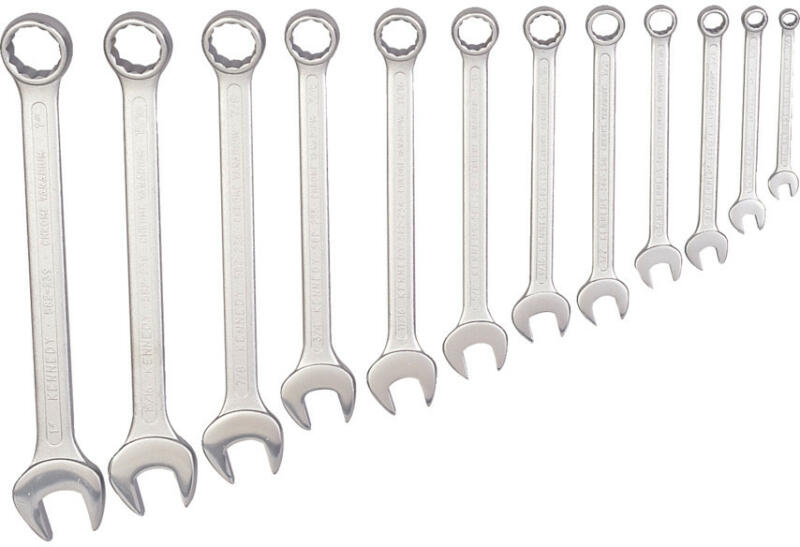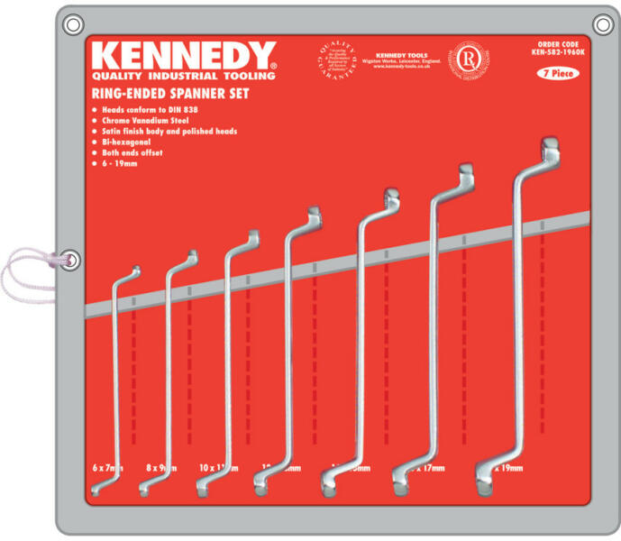 Selyemfény polírozású, króm-vanádium acélból készült kulcsok, polírozott és hajlított fejekkel. DIN 838 Metrikus és AF, BS 192 : 1982 és BS 3555 : 1998 Whitworth szerint gyártva. Készletek 7 darabos metrikus (KEN-582-1960K): 6 x 7, 8 x 9, 10 x 11, 12 x 13, 14 x 15, 16 x 17 és 18 x 19mm. 11 darabos metrikus (KEN-582-1970K): 6 x 7, 8 x 9, 10 x 11, 12 x 13, 14 x 15, 16 x 17, 18 x 19