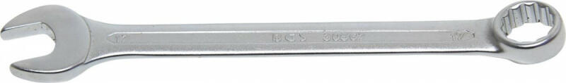 Csillag-villáskulcs, Rövid kivitel. Egyenes-szárú, mindkét vége 15°-kal hajlított (villás vége horizontálisan, csillag vége vertikálisan). Markolata sima felületű. Teljes felülete fényesre polírozott. DIN3113 Méret: 17mm Tanúsítvány: ISO 9001:2000 Company