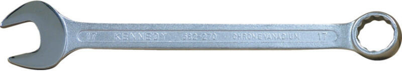 Selyemfény polírozású, króm-vanádium acélból készült kulcs, polírozott és 15°-ban hajlított fejekkel. Méret: 17 mm Teljes hossz: 210 mm Súly: 130 g