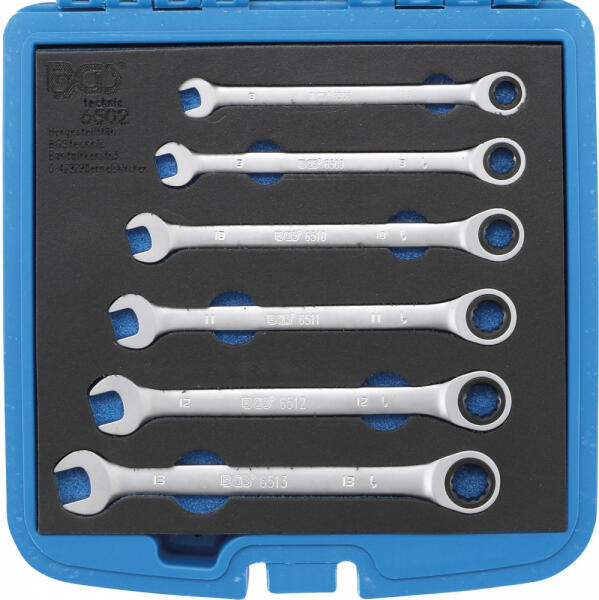 BGS technic Racsnis csillag-villáskulcs készlet | 8 - 13 mm | 6 darabos (BGS 6502) Króm vanádium acélból készül;Matt-króm bevonat;Finom járású, 72 fogas kilincsmű;Műanyag kofferben. A készlet tartalma: BGS technic Racsnis csillag-villáskulcs | 8 mm (BGS 6508) BGS technic Racsnis csillag-villáskulcs | 9 mm (BGS 6509) BGS technic Racsnis csillag-villáskulcs | 10 mm (BGS 6510) BGS t