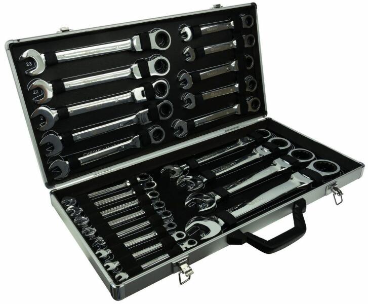 Leírás 22db-os csuklós racsnis csillag-villáskulcs készlet 6-32mm. A 12 pontos racsnis vég akár min. 5°-os elfordítással is hatékony. Méretek: 6, 7, 8, 9, 10, 11, 12, 13, 14, 15, 16, 17, 18, 19, 20, 21, 22, 23, 24, 27, 30, 32 mm. A termék jellemzői A 72 fogú racsnis 180°-ban elforgatható vég lehetővé teszi a legproblémásabb csavarok elérését is Villás vége 15°-ban dönt