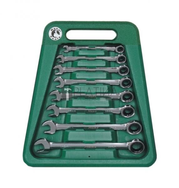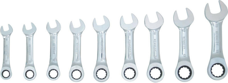 Rövidszárú (zömök) króm-vanádiészült csillag-villáskulcsok, tükörfény polírozással. A tükörfény polírozás megakadályozza az olaj és piszok kulcshoz való ragadását, könnyű tisztítást biztosítum acélból k és véd a rozsdásodás ellen. Erősített pofákkal és racsniscsillagrésszel. ASME B107.6 szerint gyártva. Készletek összetétele: 9 darabos metrikus készlet