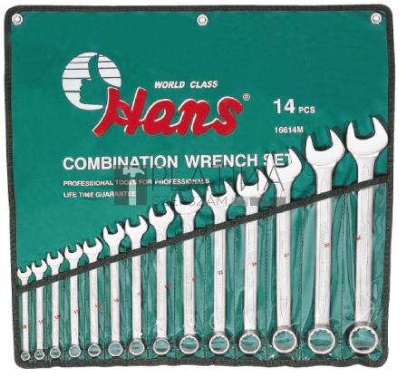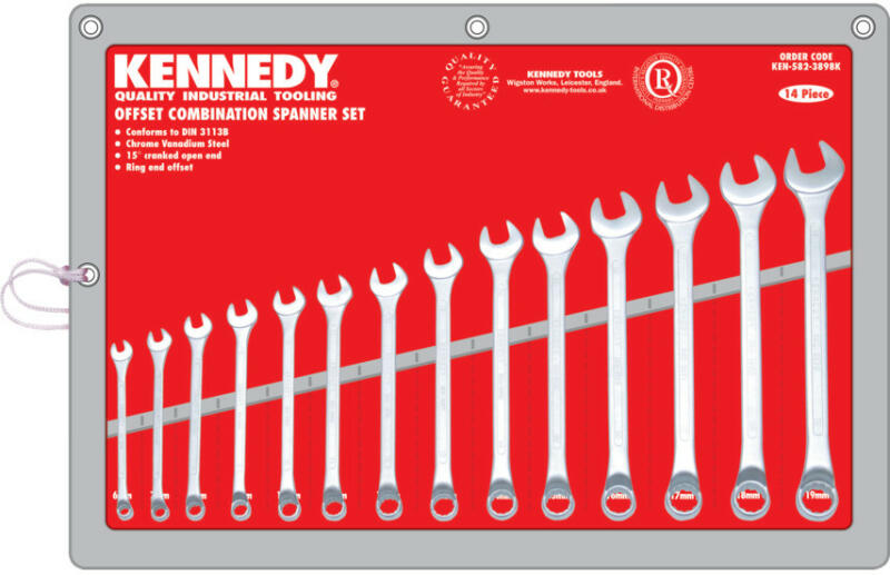 Króm-vanádium acélból gyártva. Polírozott és 15° -ban hajlított villás oldal. Hajlított csillag oldal. 25%-al hosszabb, mint a hagyományos DIN3113 szerint gyártott kivitel. 14 darabos készlet összetétele: 6, 7, 8, 9, 10, 11, 12, 13, 14, 15, 16, 17, 18 és 19 mm-es kulcsok.