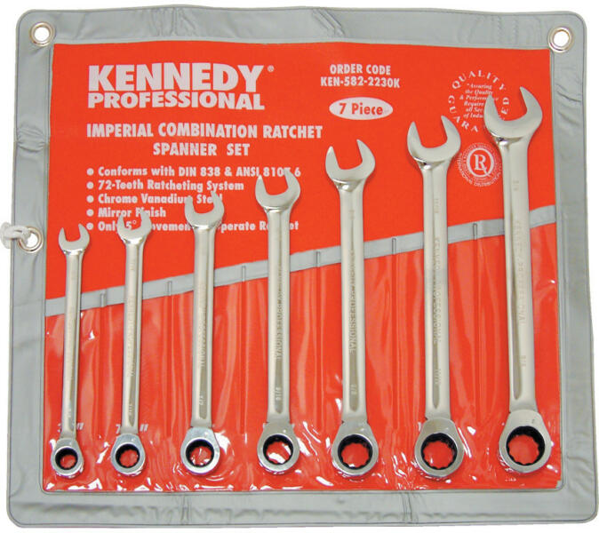 Króm-vanádium acélból készült csillag-villáskulcsok, tükörfény polírozással. A tükörfény polírozás megakadályozza az olaj és piszok kulcshoz való ragadását, könnyű tisztítást biztosít és véd a rozsdásodás ellen. 72 fogas racsni, 5°-os mozgást biztosít. Vékony kivitel a nagyobb használhatóságért. ASME B107.6 szerint gyártva. Készletek összetétele: 3/8", 7/