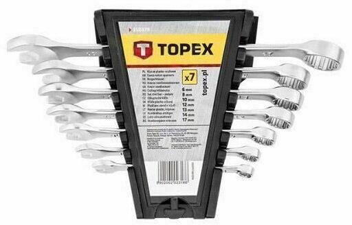 A TOPEX 35D379 készlet 7 db, a leggyakrabban használt méretű, parktikus akasztón elrendezett csillag-villás kulcsot tartalmaz. A szerszámok kiváló minőségű, hosszú élettartamot biztosító CrV acélból készül. A kulcsok SPLINE típusú csillagszemei lehetővé teszik használatukat különféle fejű csavarokhoz (többek között metrikus és colos hatlapúakhoz, metrikus és colo