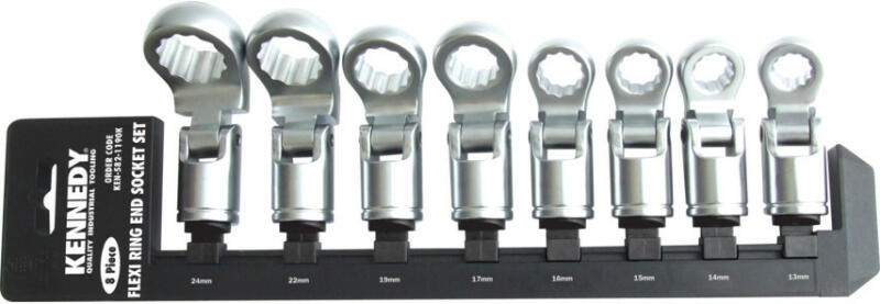 Anyaguk fényezett króm-vanádium ötvözet. Ezek az erősdönthető végcsatlakozós csavarkulcsfejek lehetővé teszik a nehezen hozzáférhető helyen lévő csavarok elérését. 220° -ban forgatható. A nyolc darabos metrikus készlet tartalma: 13, 14, 15, 16, 17, 19, 22, és 24 mm-es kulcsok. Tartósínnel együtt kapható.