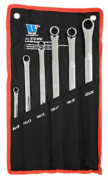Fényesre polírozott extra hosszú egyenes csillagkulcs készlet. A hosszúságának köszönhetően nagyobb nyomatékot fejthetünk ki vele. Tulajdonságok: - extra-hosszú egyenes - 0 °-os eltolás Méretek: 8x10 mm, 11x13 mm, 14x15 mm, 16x17 mm, 18x19 mm, 22x24 mm Súly: 2 kg Szín: króm Anyag: Chrome Vanadium acél