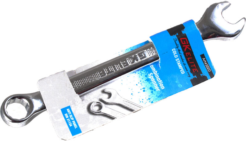 Csillag-villáskulcs. Recézett, dombornyomásos markolat a csúszásmentes fogásért. Egyenes-szárú, mindkét vége 15°-kal hajlított (villás vége horizontálisan, csillag vége vertikálisan). Teljes felülete fényesre polírozott. Méret: 15mm A termék megfelel a DIN 3113A előírásainak. An ISO 9001:2000 Company.