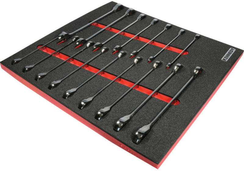 A készlet tartalma:Metrikus racsnis csillag-villáskulcsok: 10, 11, 12, 13, 14, 15, 16, 17, 19 mm-esAF-colos racsnis csillag-villáskulcsok: 3/8", 7/16", 1/2", 9/16", 5/8", 11/16", 3/4" Classic szerszámos szekrényekhez. 2/3-os: A betét mérete: 384 x 406 x 25 mm
