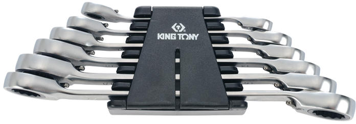 King Tony racsnis csillagkulcs készlet adatai 6db-os készlet Méretek: a 3737-es csillagkulcsokból 8 x 9, 10 x 11, 12 x 13, 14 x 15, 16 x 18, 17 x 19 mm Csavarkulcs készlet műanyag tartóban Súly: 0,72kg Racsnis csillagkulcs jellemzői Polírozott króm felülettel 5 ° szögosztásos racsnival, 72 fog Mindkét oldalon 13 °os hajlítással és irányváltós racsnival. King Tony racsnis csi