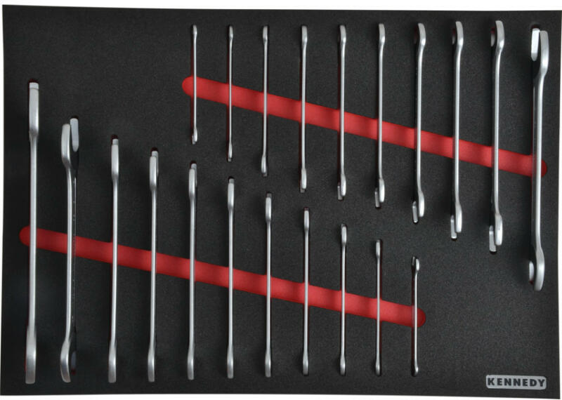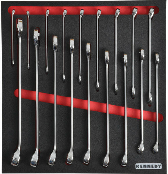 A készlet tartalma:Metrikus racsnis csillag-villáskulcsok: 6, 7, 8, 9, 10, 11, 12, 13, 14, 15, 16, 17, 18, 19, 20, 21, 22, 24 mm-es Ultimate és Industrial szerszámos szekrényekhez, felső ládákhoz. 2/3-os: A betét mérete: 380 x 396 x 20 mm