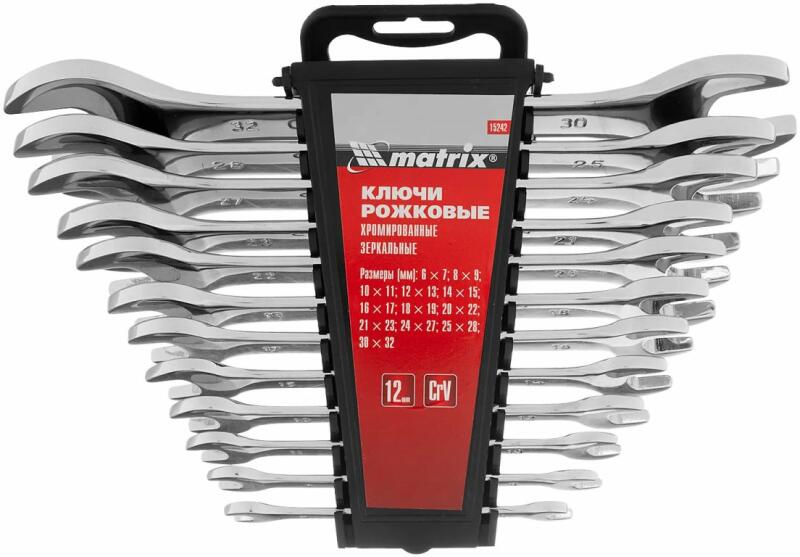 A Matrix Elliptical 15242 villáskulcs készlet 12 darab CrV acélt tartalmaz, tükrös krómozással, és hatszögprofilú, 6-32 mm-es fejmérettel rendelkező menetes csatlakozások elemeinek meghúzására és lecsavarására szolgál. A kulcsok kényelmesek a korlátozott helyen végzett manipulációkhoz, mert. mindegyik pofával a fogantyúhoz képest szöget zár be. A készlet hasznos lesz