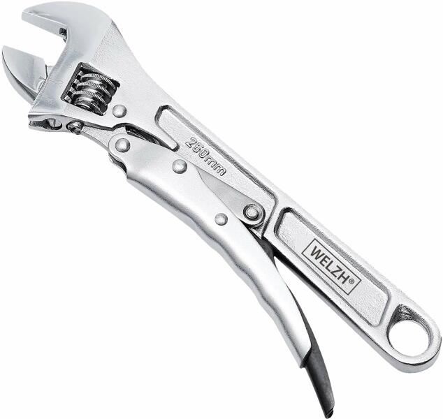 Welzh-Werkzeug- Scotland Patent fogó típusú markolat rögzíti a mozgatható pofát. PROFI önzáró fogóval van ellátva, valamint gyorskioldó karral rendelkezik. Körbeállító mechanizmus a gyors és pontos beállításhoz. Polírozott króm fej és krómozott test a korrózióvédelem érdekében. Keskeny fej kialakítás a szűk helyek eléréséhez. A beépített patent fogó stabiliz