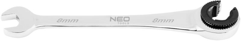 A NEO TOOLS 8 mm-es 09-255 osztott-csattantyús nyitott végű kulcs egy 8 mm-es szerszám. Jellemzője a 72 fogú racsnis résszel ellátott rés. A kulcs rendkívül tartós és krómozott felülettel rendelkezik. CrV acélból készült, hidraulikus és mechanikus munkáknál, pl. üzemanyag- és fékrendszerek kerékanyáinak felszerelésénél és eltávolításánál használatos. A NEO TOOL