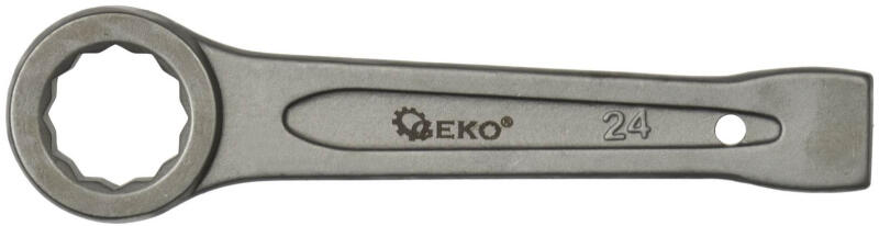 Geko Üthető metrikus csillagkulcs. Erős Chrome-Vanádium acélból készítve, Rendkívűl erős Chrome-Vanádium ötvözet acélból készített A profil felett középen átfúrt lukkal tervezett a könyebb erőfeszítés érdekében A csillagkulcs felhelyezése után a másik végén kialakított (megvastagított) részre üthetünk, arra megfelelő szerszámmal. Tulajdonságok: Méret: 24 m