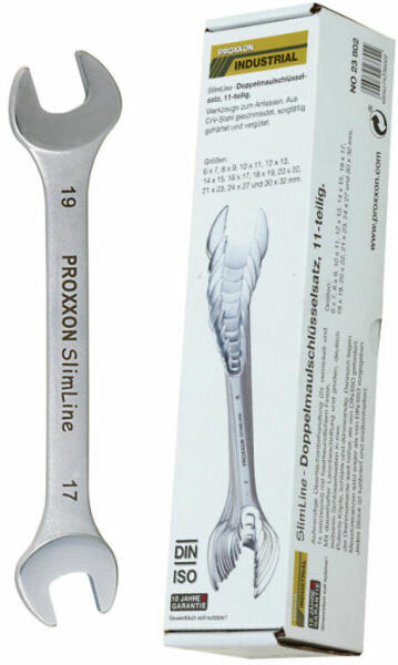 Cikkszám: 23.802Jellemzõ: 6-32Slim - Line villáskulcskészlet. 11 részes. 6 - 32 mm ig. DIN 3110 és ISO 3318 szerint. Méretek: 6 x 7, 8 x 9, 10 x 11, 12 x 13, 14 x 15,16 x 17, 18 x 19, 20 x 22, 21 x 23, 24 x 27 és 30 x 32 mm. Együtt 11 kulcs kartonban.