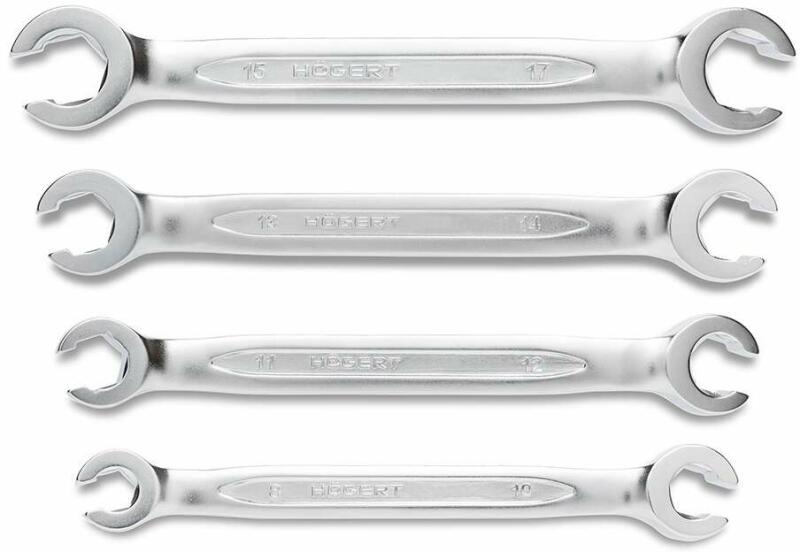 HÖGERT Dupla fejű villáskulcs szett 4 db/szett, 8-17 mm CrV (HT1W730) Termék információ: Anyaga : CrV acél Méret: 8-17 mm Fék-, üzemanyag- és hidraulikus vezetékek szereléséhez alkalmas Kiváló minőségű ötvözött CrV acélból készült Formatartó S llyesztékben kovácsolt Hatszögű, 15 fokos szögben elhajlított fej Praktikus, akasztható szövettokba csomagolva A készlet