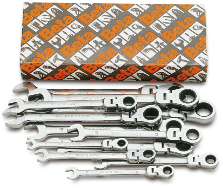 13 részes csuklós racsnis csillag-villáskulcs készlet papírdobozban. A készletben megtalálható méretek: 7-8-9-10-11-12-13-14-16-17-18-19 mm