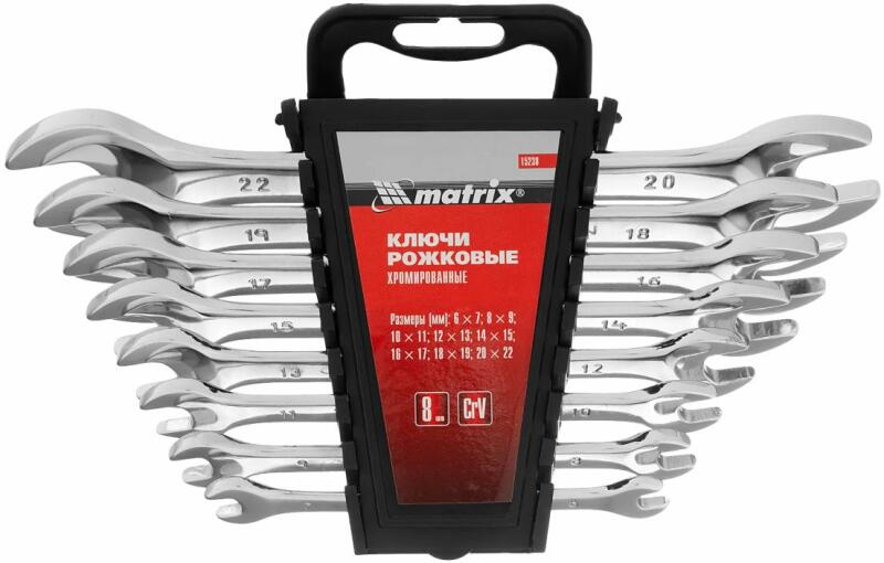 A Matrix Elliptical 15238 villáskulcs készlet 8 db tükrös króm bevonatú CrV acélt tartalmaz, és hatlapfejű, 6-22 mm-es fejmérettel rendelkező menetes csatlakozások elemeinek meghúzására és lecsavarására szolgál. A kulcsok kényelmesek a korlátozott helyen végzett manipulációkhoz, mert. mindegyik pofával a fogantyúhoz képest szöget zár be. A készlet hasznos lesz beszere