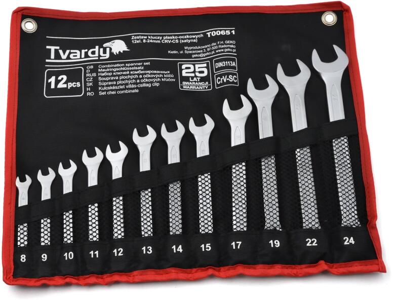 A TVARDY professzionális szerszámmárka csillag-villás kulcskészlete. A készlet 12 db 8-24 mm-es méretű csillag-villás kulcsot és egy erősített fűzőlyukakkal ellátott, falra akasztható tartó t tartalmaz . Rendkívül erős CRV hidegen kovácsolt szerszámacélból készült . A kulcsokat gondos hőkezelési eljárásnak vetik alá . Vákuumkemencében edzett és olajban lehűtött