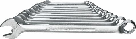Készlet tartalma: 6 7 8 9 10 11 12 13 14 15 16 17 18 19 20 21 22 23 24 25 26 27 28 29 30 32 nagyságú csavarkulcs A leggyakrabban használt méretek egy készletbenDIN 3113 B alak, ISO 3318, ISO 7738 szerinti kivitelGEDORE vanádium acél 31CrV3, krómozottA gyűrűkulcsfej 10 ° -os szöget zár be, a gyűrűkulcsfej pedig meghajlik