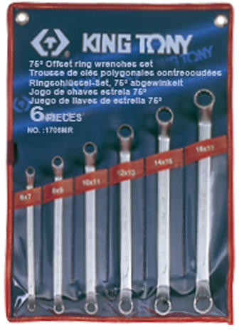 King Tony csillagkulcs készlet adatai 6db csillagkulcs vászon tasakban. Méretek: 6x7, 8x9; 10x11; 12x13; 14x15; 16x17mm King Tony csillagkulcs jellemzői Európai vékony típus 75 °os hajlítással Vékony falú fejjel Króm-vanádium ötvözött acél Krómozott felületű csavarkulcs Metrikus méret - DIN 838