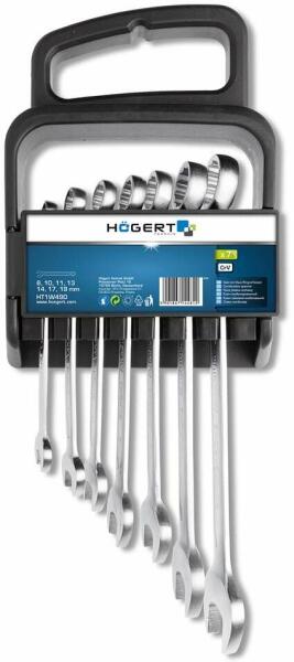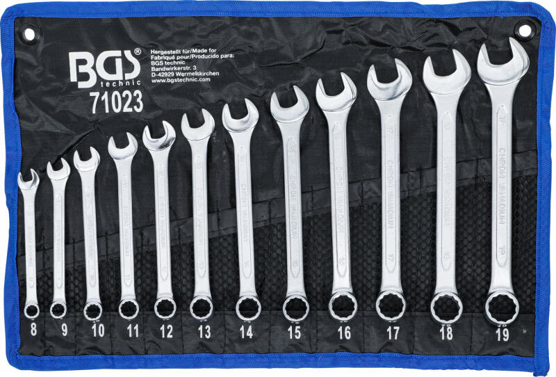Melegen kovácsolt. Krómozott, teljesen polírozott fejek. Gyűrűvég 15°-ban hajlított, tizenkétszögletű. Összegöngyölhető tárolóban. Méretek: 8, 9, 10, 11, 12, 13, 14, 15, 16, 17, 18, 19 mm Szabvány: DIN 3113-A Anyag: króm-vanádium acél Bruttó súly: 1136 g