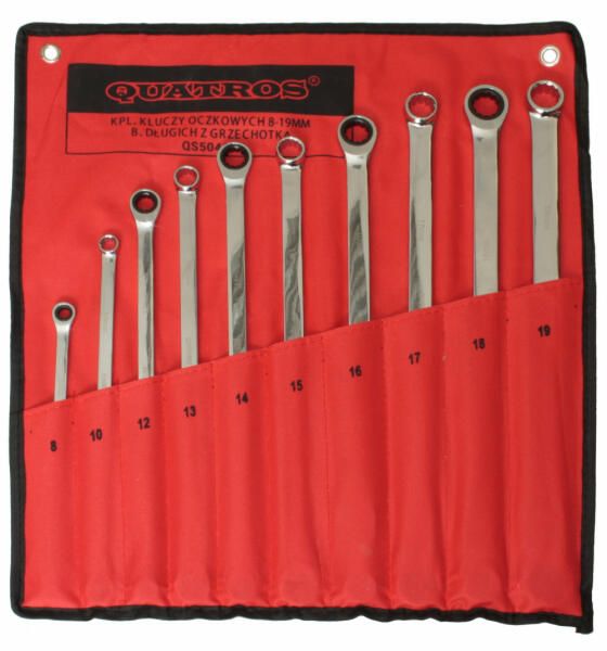 QUATROS TOOLS Extra hosszú egyenes racsnis csillagkulcs készlet. Leírás: Extra hosszú, és egyenes kivitel, Vékony fejkialakítása miatt szűk helyeken is jól használható, Egyik oldalán racsnis, Vászon tartózsák. A készlet tartalma: 8 mm x 237 mm 10 mm x 292 mm 12 mm x 327 mm 13 mm x 346 m 14 mm x 367 mm 15 mm x 374 mm 16 mm x 390 mm 17 mm x 407 mm 18 mm x 412 mm 19 mm x 420 mm