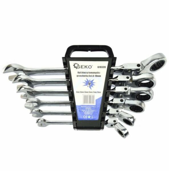 A termék leírása: Rugalmas fejű racsnis csavarkulcs kombinált kulcskulcs készlet 8-19 mm 6db. A 12 pontos Ratcheting Box-Endnek mindössze 5 fokra van szüksége a rögzítőelem mozgatásához, összehasonlítva a 30 fokos standard dobozvéggel. A készlet 6 darab rugalmas fejű racsnis kulcsot tartalmaz: 8, 10, 13, 15, 17, 19 mm. A termék jellemzői: A 72 fogú racsnis 180 fokos rugalmas