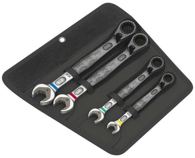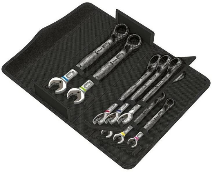 A Wera reverzibilis kombinált racsnis kulcs, a Joker Switch (itt 11 darabos készletben) sokoldalú a nyitott kulcsok között. Döntő előnyöket kínál, egyrészt a tartási funkció, amely lehetővé teszi a csavar és az anya kiegészítő szerszámok nélküli betáplálását azzal, hogy hatékonyan megakadályozza a szájból való kiesést. Ez lehetővé teszi a szál gyors és pontos b