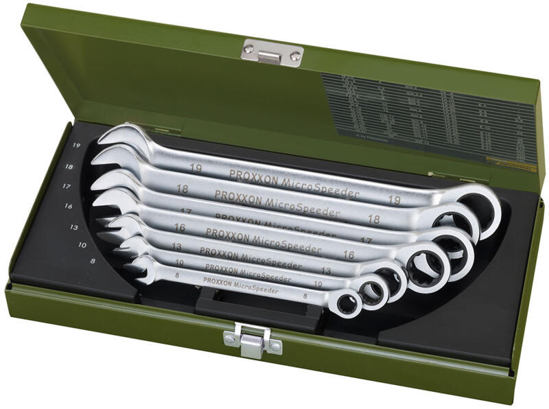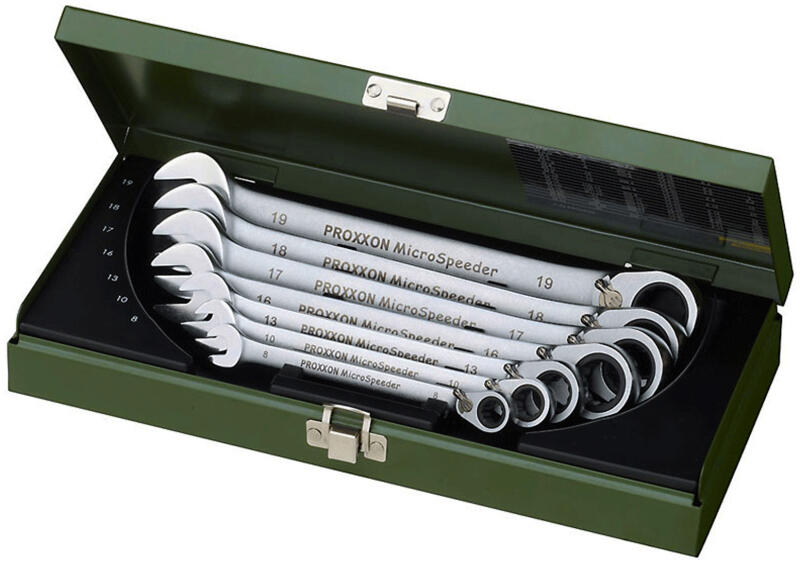 Gyűrűs-villás kulcssorozat, racsni funkcióval Micro Speeder 7 részes. MicroSpeeder gyűrűs oldalon racsni funkcióval Különösen hosszú kivitel Kar átkapcsolás Jellemzők: 72 fogú, magasan ötvözött speciális acél belső gyűrűvel, a meghajtás 5°-os elmozdulásnál már működik. Az átvihető nyomatékok mégis messze meghaladják a DIN/ISO előírást. Ezt a különösen hoss