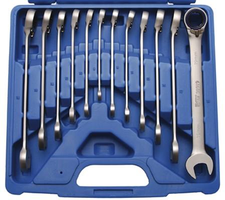 YATO YT-16973 12 db-os kombikulcs készlet racsnival és csuklóval. A csukló lehetővé teszi a csavarkulcs használatát nehezen elérhető helyeken. A tok megkönnyíti a kulcsok kényelmes elérését és rendet tart a műhelyben. kivitel: CrV acél keménység: 42-49 HRC racsnis fogak száma: 72 dobozkulcs típusa: tizenkét oldalú felületkezelés: krómozott, polírozott, indukciósan edz