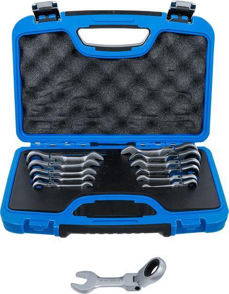 sok darabból álló, rövid kivitelű racsnis csillag-villáskulcs készlet minden kereskedelmi forgalomban kapható mérettela felcsavarozott csuklónak köszönhetően folyamatosan 90°-os szögben hajlíthatókiváló minőségű króm-vanádium acélból készült a hosszú élettartam és tartósság érdekébenuniverzálisan alkalmazható működtető és ellentartó csavaros csatlakozások