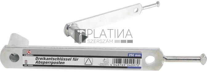 Angol nyelvű leírás (a magyar fordítást lásd lejjebb):M12 triangular wrench with rivet hooksLeg width 19 mmsuitable for almost all shut-off points, barriers, etc. with triangular lockMagyar fordítás (fordító automata segítségével):M12 háromszög alakú csavarkulcs szegecshorogokkalA lábszélesség 19 mmszinte minden leállási ponthoz, akadályhoz stb. alkalmas. háromszög alakú z