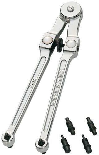 Króm-vanádium acélból kovácsolva. Hornyolt anyák vagy oldalsó furatú anyák megfogására. Kapacitás 18-100 mm. Gyors és pontos beállítás. 6 db kétoldalas tűvel, 110.6 hivatkozási számmal. Krómozott kivitel.