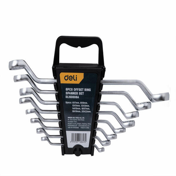 Deli Tools EDL150008A gyűrűs villáskulcs készlet, 8 db Double Box Wrench Sets Deli Tools EDL150008A Set of 8 double box wrenches in various sizes. The practical plastic stand makes it easy to store and transport the tools and can be easily hung in the workshop. The wrenches are made of corrosion-resistant carbon steel and are therefore extremely robust. The tools are ideal for use in hard-to-r