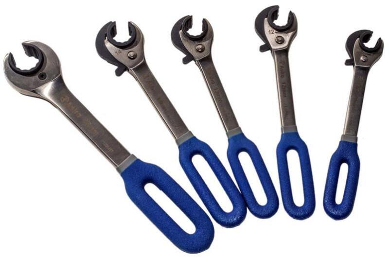 5 db speciális racsnis fékcsőkulcsMéretek: 10, 12, 13, 14, 17 mm 72 fogas (5°) racsnis adapterekkel. A fékcsőkulcs feje úgy van kiképezve, hogy a rajta lévő nyílás segítségével könnyen rá lehet helyezni a fékcsőre, megvastagított feje pedig megakadályozza a szétnyílást, és a csavarfej roncsolódását. A 17-es kulcs kivételével mindegyik fékcsőkulcson van gyorskioldó
