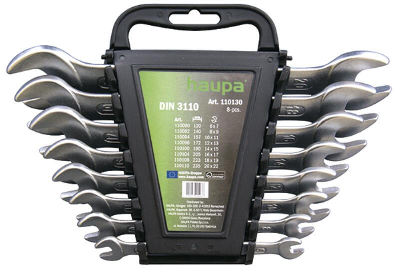 Haupa 110130 Villáskulcs készlet kétoldalas 8 részes Haupa kétoldalas villáskulcs készlet DIN 3110 szerint Krómozott, króm-vanádium acélból, köszörült fejjel, műanyag tokkal együtt. Választható méretek: Cikkszám: 110130 kulcstáv. : 6-22 Készlet: 8 részes Cikkszám: 110132 kulcstáv. : 6-32 Készlet: 12 részes