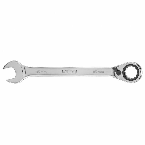 Neo racsnis csillag-villáskulcs. A csillagkulcs 72-fogas kilincsműve gyors, pontos munkát tesz lehetővé. A kiváló minőségű króm-vanádium acél sokéves tartósságot biztosít. A Neo márka a professzionális igényeket is kielégíti. Kombinált csavarkulcs 16 mm-es racsnisszal, CrV acél, 72 fogas racsnis