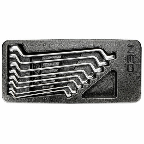 Neo Csillag kulcs készlet, hajlított (Ref. sz. 84-233) 8 db normális méretű kulcsot tartalmaz (6 - 22 mm), a DIN 838 szabvány szerint készült. A kimagasló minőségű króm-vanádium acél biztosítja a kulcsok sokéves tartósságát. A szerszámok praktikus, a Neo 84-221 és 84-222 szerszámos szekrények fiókjaiba illő műanyag bőröndben leszállítva. A termék megbízhatóságát